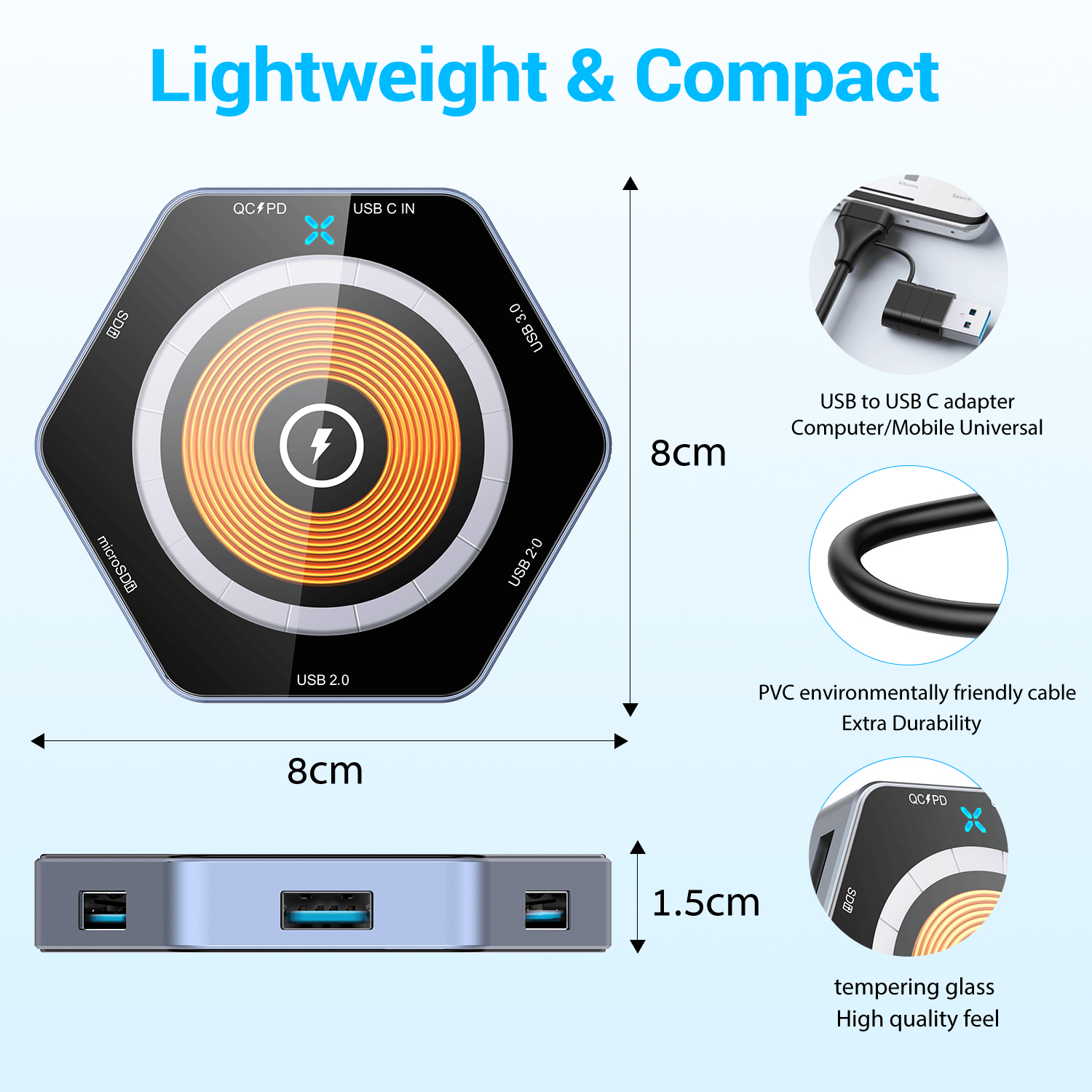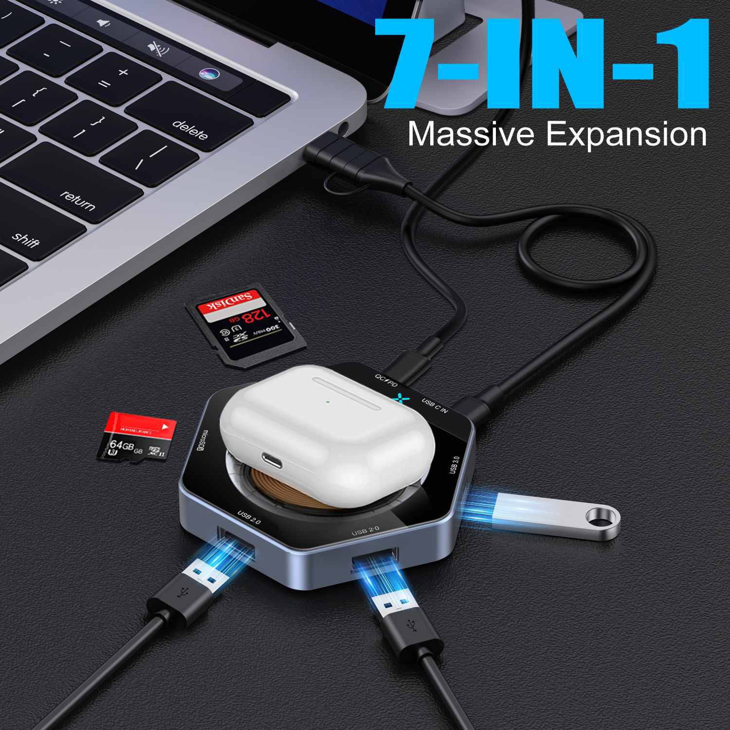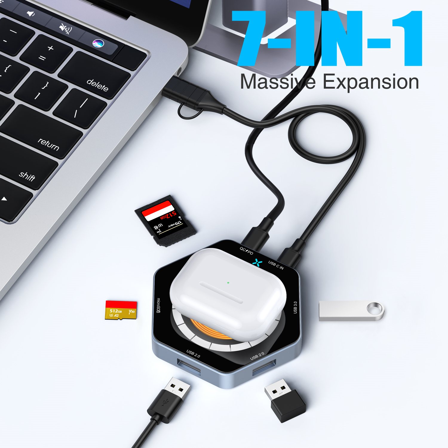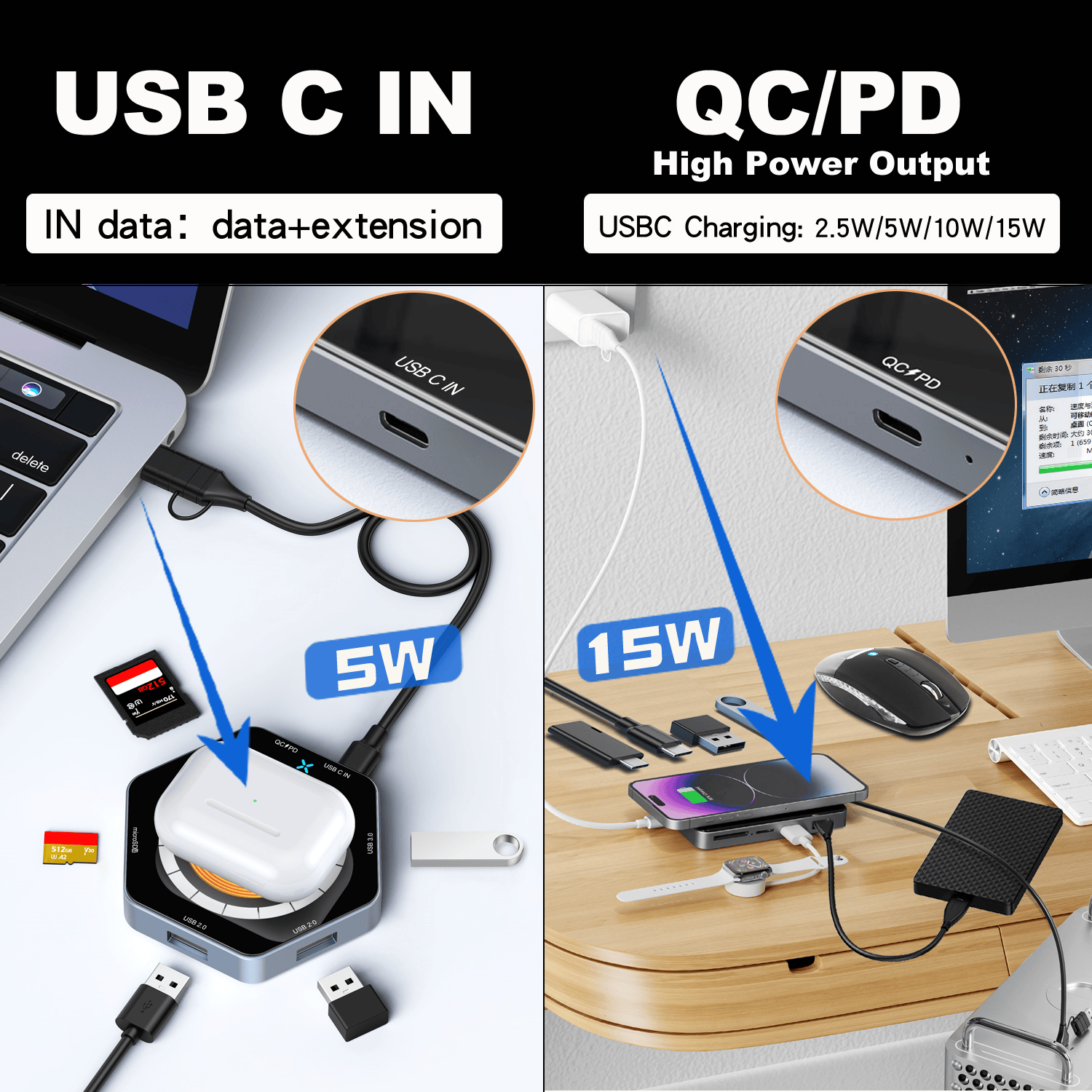 | Paggamit ng produkto | 1.USB C 5-in-1 na pagpapalawak, paghahatid ng data ng high-speed, pagpapalawak ng panlabas na aparato tulad ng: konektado mouse, keyboard, u disk at SD+tf basahin at isulat.2.Support ang 15W wireless mabilis na bilis ng singilin, magnetic design mas tumpak na posisyon ng coil, sa mobile phone na mas matatag na output ng kuryente. | ||||